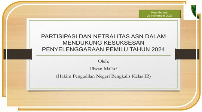 Hakim Pengadilan Negeri Bengkalis Kelas IB, Bapak Ulwan Ma’luf, S.H. menjadi narasumber dalam penyuluhan hukum kepada ASN di lingkungan Pemerintah Daerah Kabupaten Kepulauan Meranti.